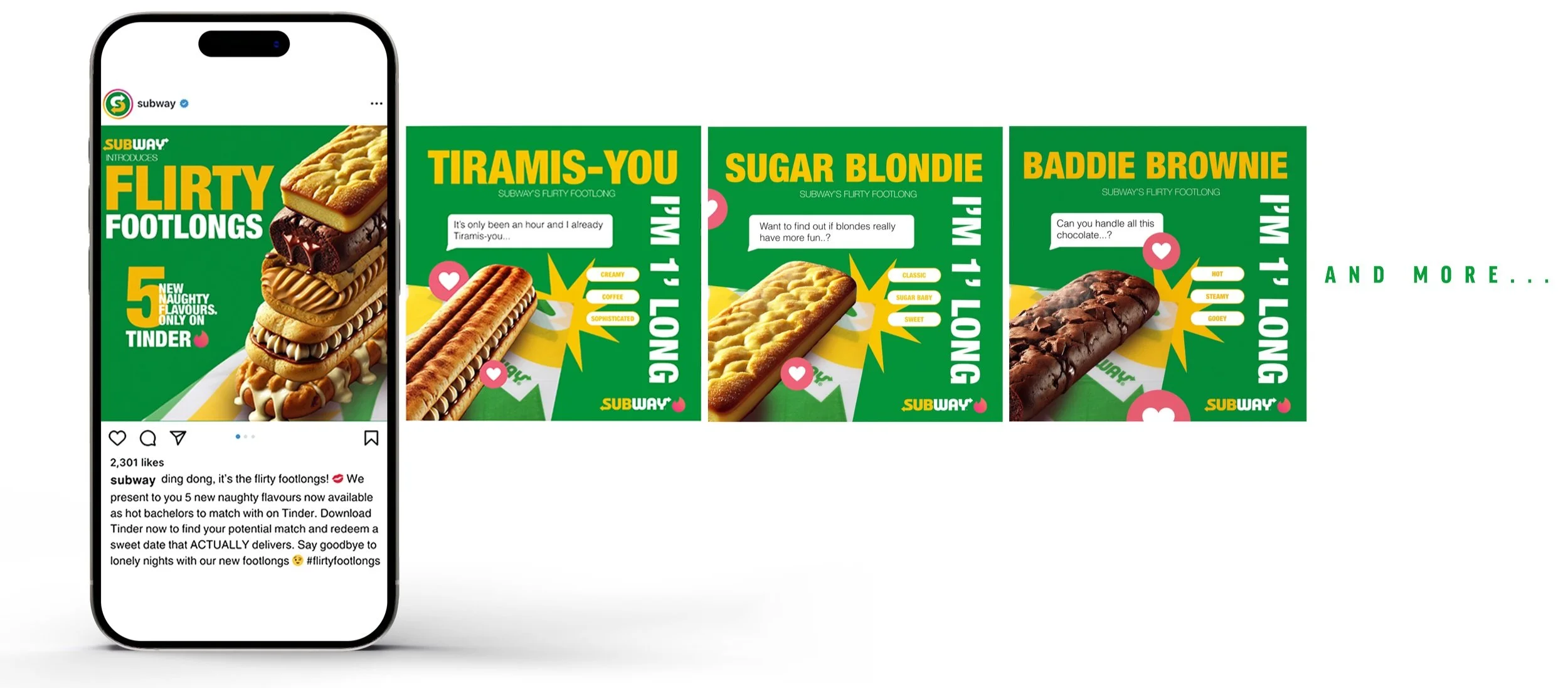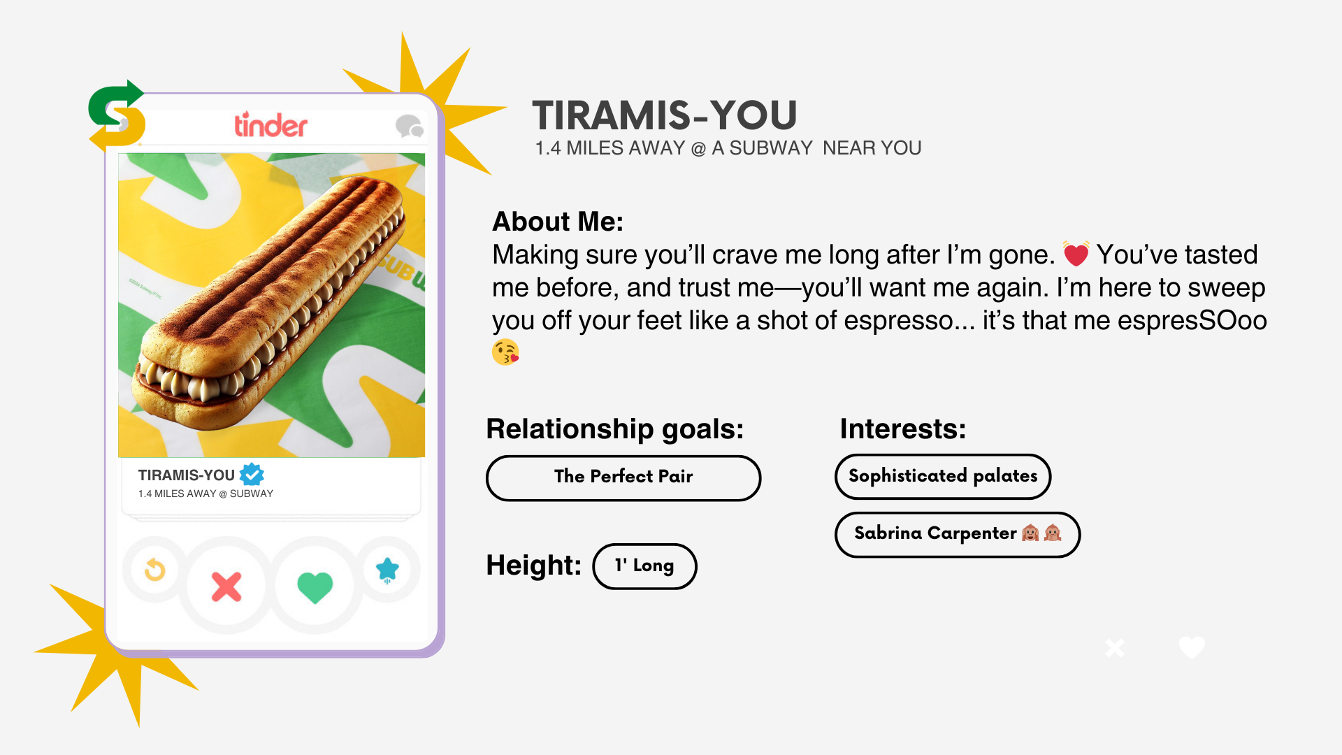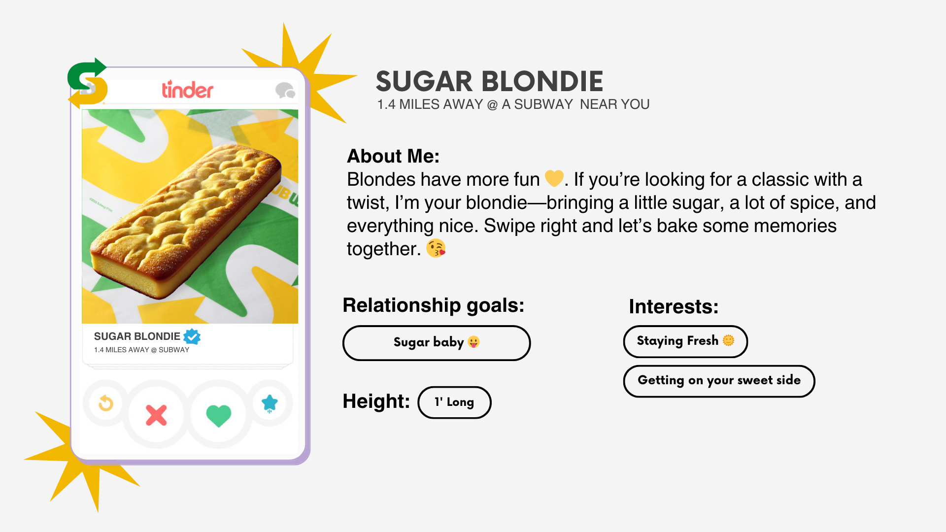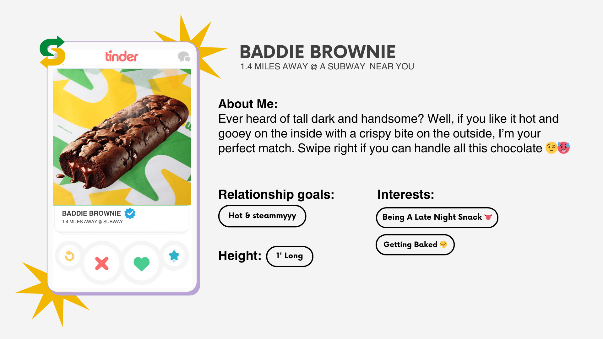 Collab with Tinder to create fun, wacky, jaw-dropping Tinder profiles for a new line of flirty footlongs, designed to spark right swipes. Each match reveals much more than a sweet treat—introducing the flirty footlong: the date that actually delivers.